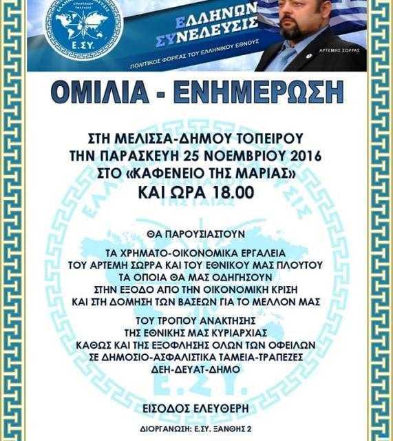 Την Παρασκευή 25 Νοεμβρίου 2016 και ώρα 6 το απόγευμα, η << ΕΛΛΗΝΩΝ ΣΥΝΕΛΕΥΣΙΣ ΞΑΝΘΗΣ 2>> θα πραγματοποιήσει ανοιχτή εκδήλωση ενημέρωσης στο χωριό Μέλισσα του Δήμου Τοπείρου, στο « Καφέ της Μαρίας».