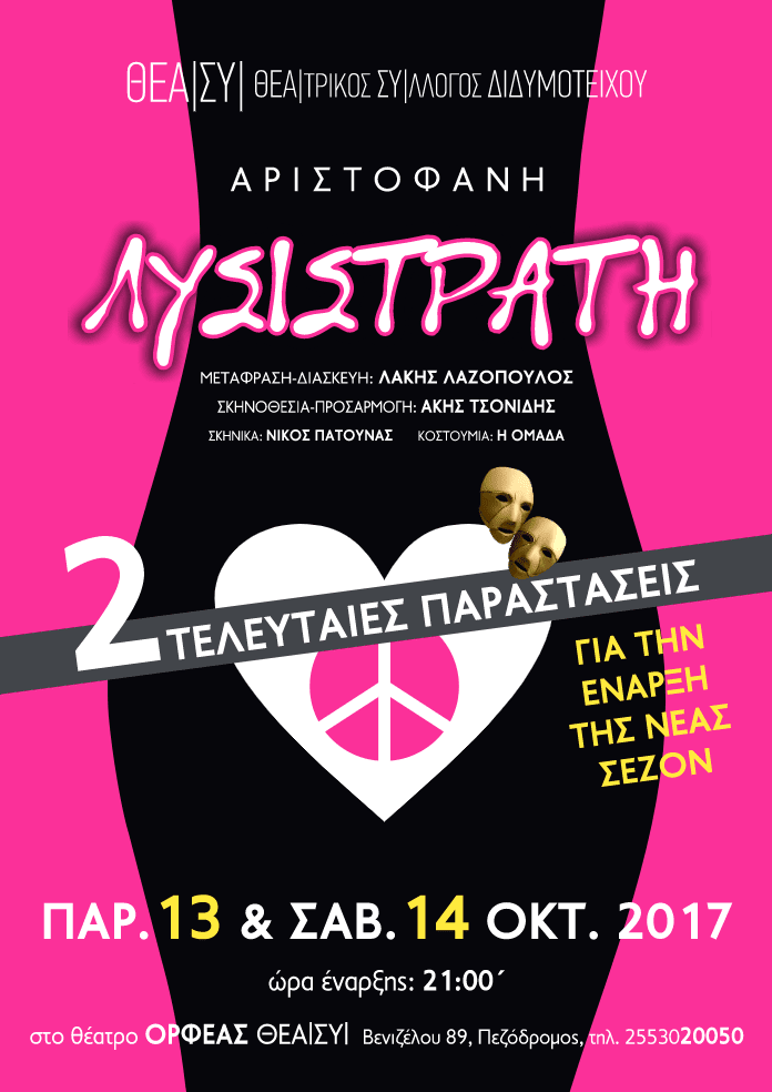 Ο ΘΕΑ|ΣΥ Διδυμοτείχου ανοίγει την νέα θεατρική χρονιά με 2 τελευταίες παραστάσεις της ‘ΛΥΣΙΣΤΡΑΤΗΣ” την Παρασκευή 13 και το Σάββατο 14 Οκτωβρίου στις 9 το βράδυ στο Θέατρο ΟΡΦΕΑΣ στο Διδυμότειχο.