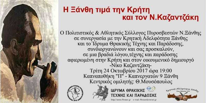 Σύμφωνα με ανακοίνωση του πολιτιστικού και Αθλητικού Συλλόγου Πυροσβεστών Ν. Ξάνθης την Τρίτη 24 Οκτωβρίου 2017 ώρα 7 το απόγευμα θα πραγματοποιηθεί στο Ίδρυμα