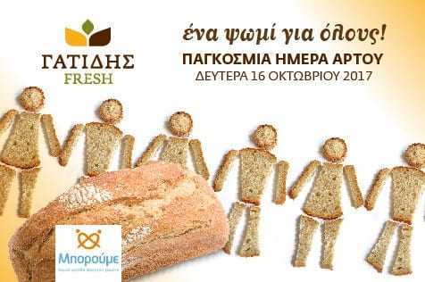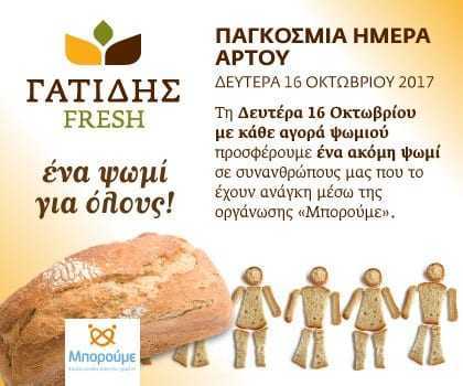 Τη Δευτέρα 16 Οκτωβρίου 2017, με αφορμή την Παγκόσμια Ημέρα Άρτου υλοποιούμε την ενέργεια «Ένα ψωμί για όλους». Με κάθε αγορά ψωμιού από τα καταστήματα Γατίδης Fresh, προσφέρουμε ένα ακόμη ψωμί σε συνανθρώπους μας που το έχουν ανάγκη, μέσω της οργάνωσης “Μπορούμε”.