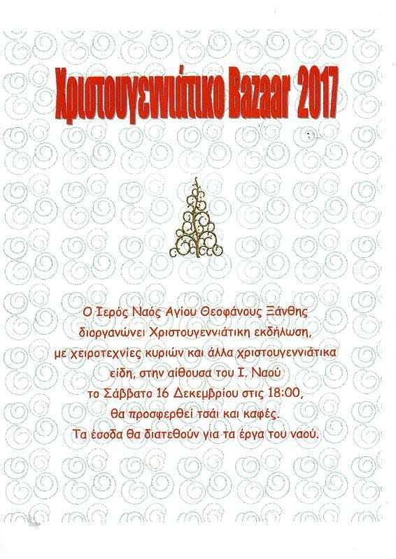 Χριστουγεννιάτικο Bazaar στον Ι.Ν. του Άγιο Θεοφάνους στην Ξάνθη 6 Δεκ. 2017 | ΚΟΙΝΩΝΙΑ, Πρωτοσέλιδο | 0 |