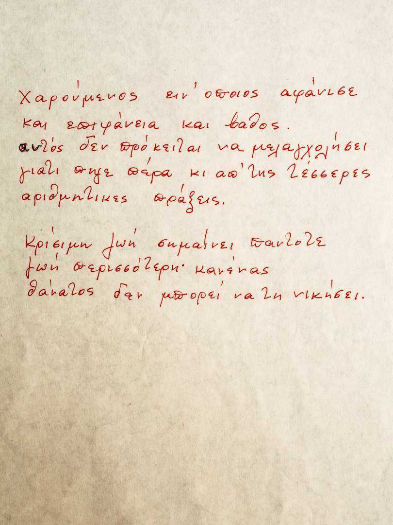 - Τι τά ’θελε και τά ’φερνε τα γράμματα / ο Δαναός στην Αργολίδα. / Μόνον αυτοί που τρέφουν όνειρα απολαμβάνουν / την πραγματικότητα.
