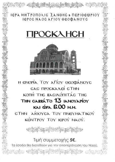 Την πίτα της κόβει η Ενορία του Αγίου Θεοφάνους 10 Ιαν. 2018 | ΚΟΙΝΩΝΙΑ | 0 | Το Σάββατο το απόγευμα στο Πνευματικό Κέντρο του Αγίου Θεοφάνους στην Ξάνθη η Ενορία θα κόψει την πίτα της.