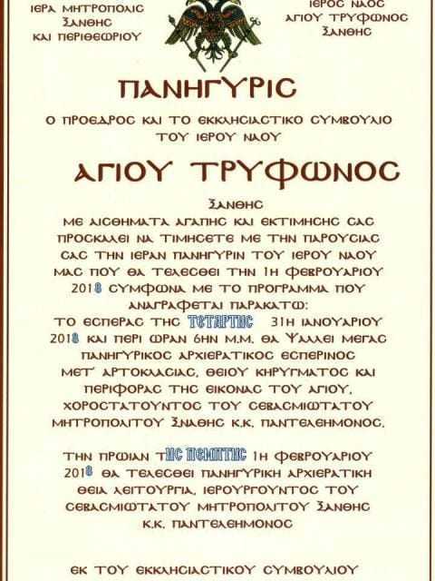 ΠΑΝΗΓΥΡΙΣ ΑΓΙΟΥ ΤΡΥΦΩΝΑ 25 Ιαν. 2018 | ΚΟΙΝΩΝΙΑ | 0 | Από την ΕΑΑΣ Ξάνθης αποστέλλετε η ανακοίνωση του Εκκλησιαστικού Συμβουλίου του Ι.Ν. Αγίου Τρύφωνος Ξάνθης σχετικά με την πανήγυρη του Ιερού Ναού.