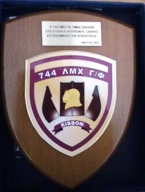 Ευχαριστούμε θερμά και το διοικητή κ. Κ. Πετράκη για την πλακέτα που χάρισε στο σύλλογο μας με την ευκαιρία της επίσκεψης τους στους παραπάνω χώρους, η οποία φέρει το σήμα του 744 ΛΜΧ, με σχετική αφιέρωση.