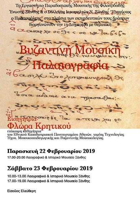 Το Εργαστήριο Παραδοσιακής Μουσικής της Φιλοπρόοδης Ένωσης Ξάνθης, ο Σύλλογος Ιεροψαλτών Ν. Ξάνθης «Γρηγόριος ο Πρωτοψάλτης» διοργανώνουν με την υποστήριξη της Ιεράς Μητροπόλεως Ξάνθης και Περιθεωρίου την 1η επιστημονική διημερίδα με θέμα: «Βυζαντινή Μουσική Παλαιογραφία» με εισηγήτρια την κα. Φλώρα Κρητικού, επίκουρη καθηγήτρια του Εθνικού Καποδιστριακού Πανεπιστημίου Αθηνών. Η διημερίδα θα φιλοξενηθεί στους χώρους του Λαογραφικού και Ιστορικού Μουσείου της Φιλοπρόοδης Ένωσης Ξάνθης.