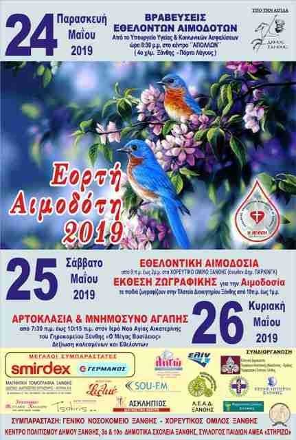 γ. Το Σάββατο 25 Μαΐου 2019 στην Πλατεία Διοικητηρίου Ξάνθης στις εγκαταστάσεις του Χορευτικού Ομίλου Ξάνθης θα υπάρχει συνεργείο της αιμοδοσίας από τις 09:00 έως τις 14:00 με την κινητή μονάδα αιμοληψιών του Νοσοκομείου μας ώστε όσοι μπορούμε, να «προσφέρουμε» για άλλη μια φορά λίγο από το αίμα μας. Κάτι που αποδείξαμε όλα αυτά τα χρόνια ότι ξέρουμε να το κάνουμε πολύ καλά. Ταυτόχρονα τις ίδιες ώρες μαθητές δημοτικών σχολείων θα ζωγραφίζουν για την αιμοδοσία στον ίδιο χώρο.