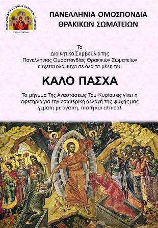 Ο Πρόεδρος και το Διοικητικό Συμβούλιο της Πανελλήνιας Ομοσπονδίας Θρακικών Σωματείων σας εύχονται ολόψυχα Καλή Ανάσταση και Καλό Πάσχα.