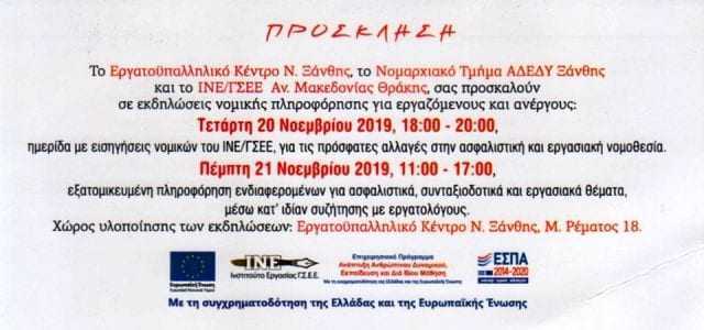 Στο πλαίσιο αυτό το Εργατοϋπαλληλικό Κέντρο Ν. Ξάνθης, το Νομαρχιακό Τμήμα της ΑΔΕΔΥ Ξάνθης και το Ινστιτούτο Εργασίας/ΓΣΕΕ Αν. Μακεδονίας Θράκης, συνδιοργανώνουν εκδηλώσεις νομικής πληροφόρησης εργαζόμενων και ανέργων. Ειδικότερα:
