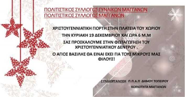 Η Κοινότητα Μαγγάνων & ο Δήμος Τοπείρου συνδιοργανώνουν τη μαγευτική Βραδιά των Φαναριών & τον στολισμό – φωταγώγηση του Χριστουγεννιάτικου δέντρου την Κυριακή 19 Δεκεμβρίου 18:00 μ.μ., στην πλατεία του χωριού με τη συνδρομή – διοργάνωση των Πολιτιστικών Συλλόγων Νεολαίας & Γυναικών.