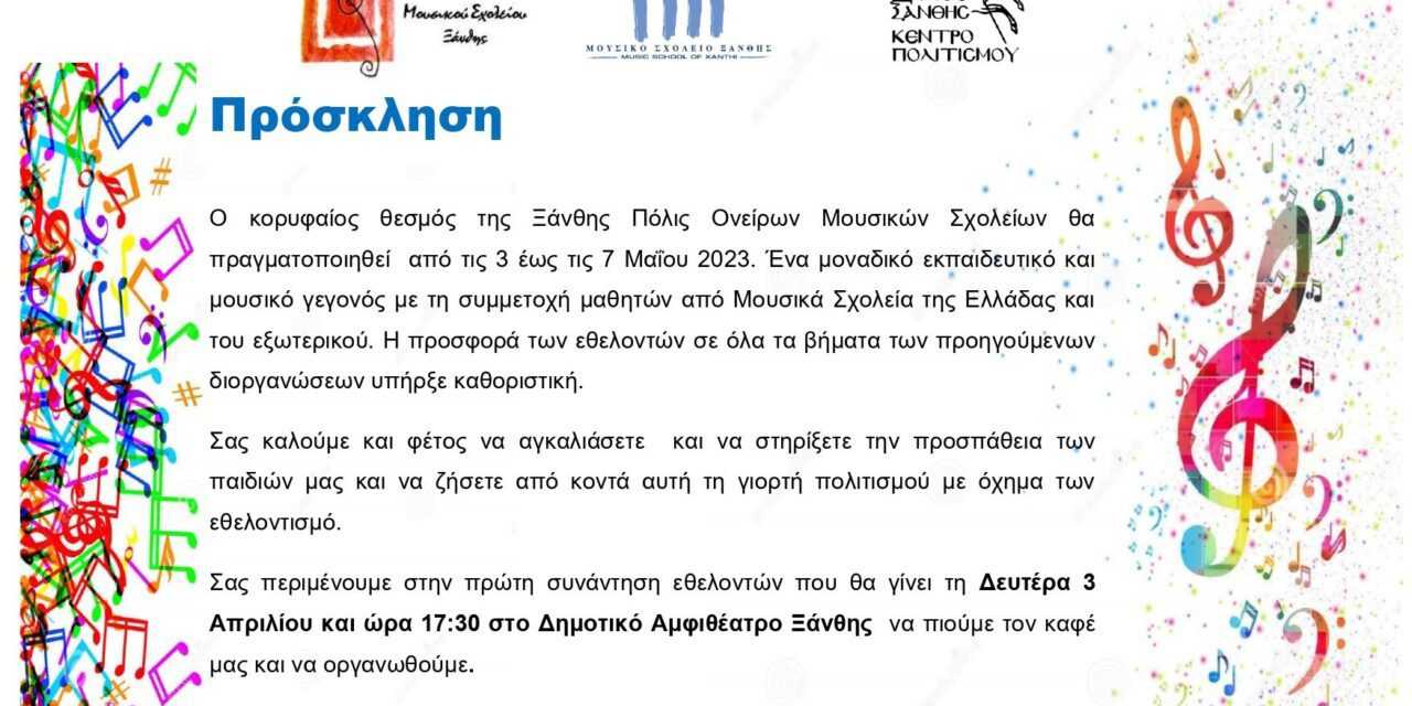 Ο κορυφαίος θεσμός της Ξάνθης Πόλις Ονείρων Μουσικών Σχολείων θα πραγματοποιηθεί από τις 3 έως τις 7 Μαΐου 2023. Ένα μοναδικό εκπαιδευτικό και μουσικό γεγονός με τη συμμετοχή μαθητών από Μουσικά Σχολεία της Ελλάδας και του εξωτερικού. Η προσφορά των εθελοντών σε όλα τα βήματα των προηγούμενων διοργανώσεων υπήρξε καθοριστική.