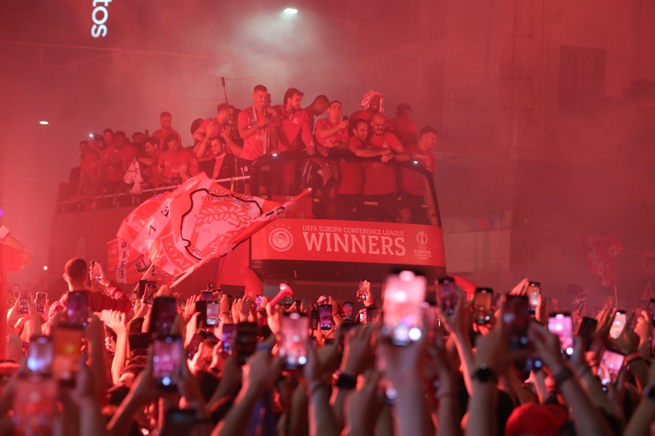 Ολονύχτιο πάρτι που κράτησε μέχρι τις πρώτες πρωϊνές ώρες έστησαν οι παίκτες και οι φίλαθλοι του Ολυμπιακού, που έκαναν την νύχτα μέρα στον Πειραιά μετά τον θρίαμβο της κατάκτησης του Europa Conference League.