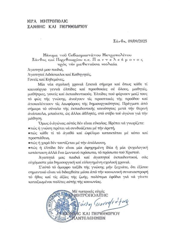 Το μήνυμα του Σεβασμιότατου Ξάνθης και Περιθεωρείου κκ Παντελήμωνα για την έναρξη της σχολικής χρονιάς
