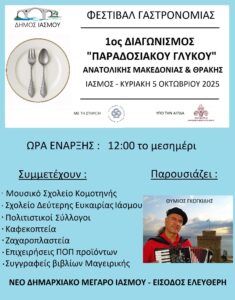 - Προσφορά δωρεάν εδεσμάτων από πολιτιστικούς συλλόγους και από το Σχολείο Δεύτερης Ευκαιρίας Ιάσμου, δημιουργημένων από τα μέλη τους.