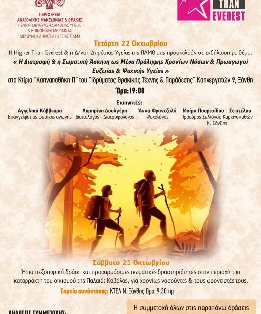 Στο πλαίσιο του προγράμματος «Υποστήριξη χρονίως νοσούντων και των φροντιστών αυτών», που υλοποιεί η Περιφέρεια Ανατολικής Μακεδονίας και Θράκης, διά της Διεύθυνσης Δημόσιας Υγείας και Κοινωνικής Μέριμνας, με την υποστήριξη της Higher Than Everest θα πραγματοποιηθούν δύο δράσεις στην Περιφερειακή Ενότητα Ξάνθης, την Τετάρτη 22 και το Σάββατο 25 Οκτωβρίου 2025. Οι δράσεις απευθύνονται σε όλους όσους έχουν βιώσει είτε προσωπικά είτε ως φροντιστές, αλλά ακόμη και ως συμπαραστάτες σε οικογενειακό ή φιλικό βιωματικό επίπεδο την εμπειρία κάποιας χρόνιας νόσου.