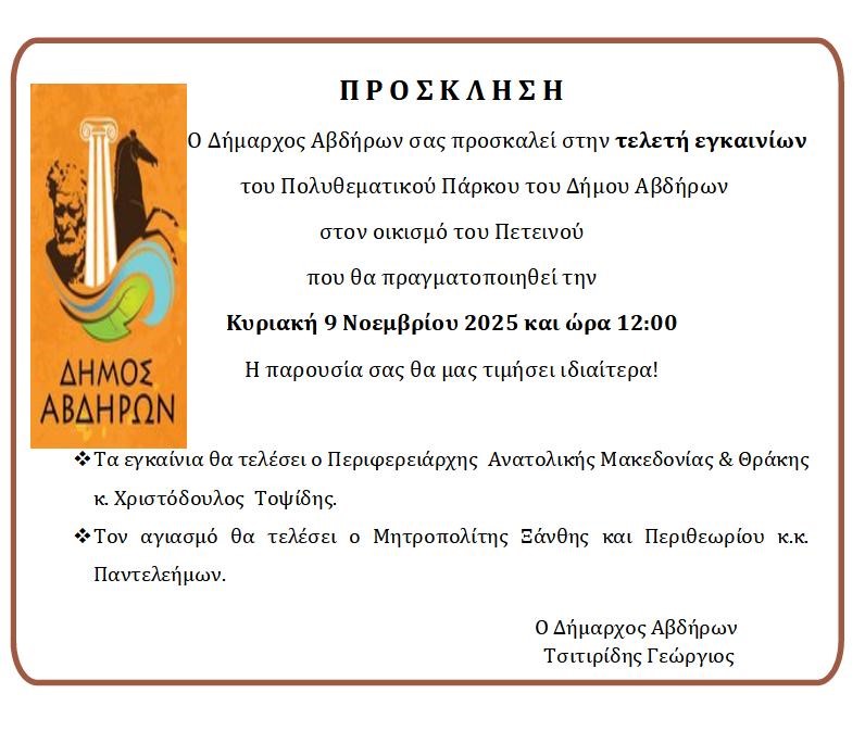 ΔΗΜΟΣ ΑΒΔΗΡΩΝ/ΕΓΚΑΙΝΕΙΑ ΠΟΛΥΘΕΜΑΤΙΚΟΥ ΠΑΡΚΟΥ- ΠΡΟΣΚΛΗΣΗ